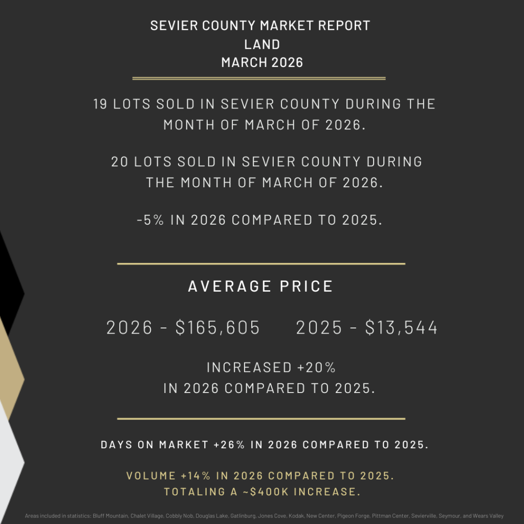 The tradeoff is time. Days on market for land increased 26%, from 93 days to 117. Land buyers in the Smokies have always been deliberate, and that pattern holds.